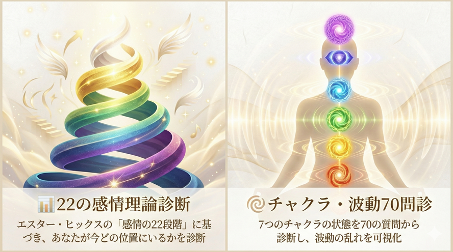 今のあなたの波動状態を知るために、以下の診断を用意しています。どちらも無料で受けられます。