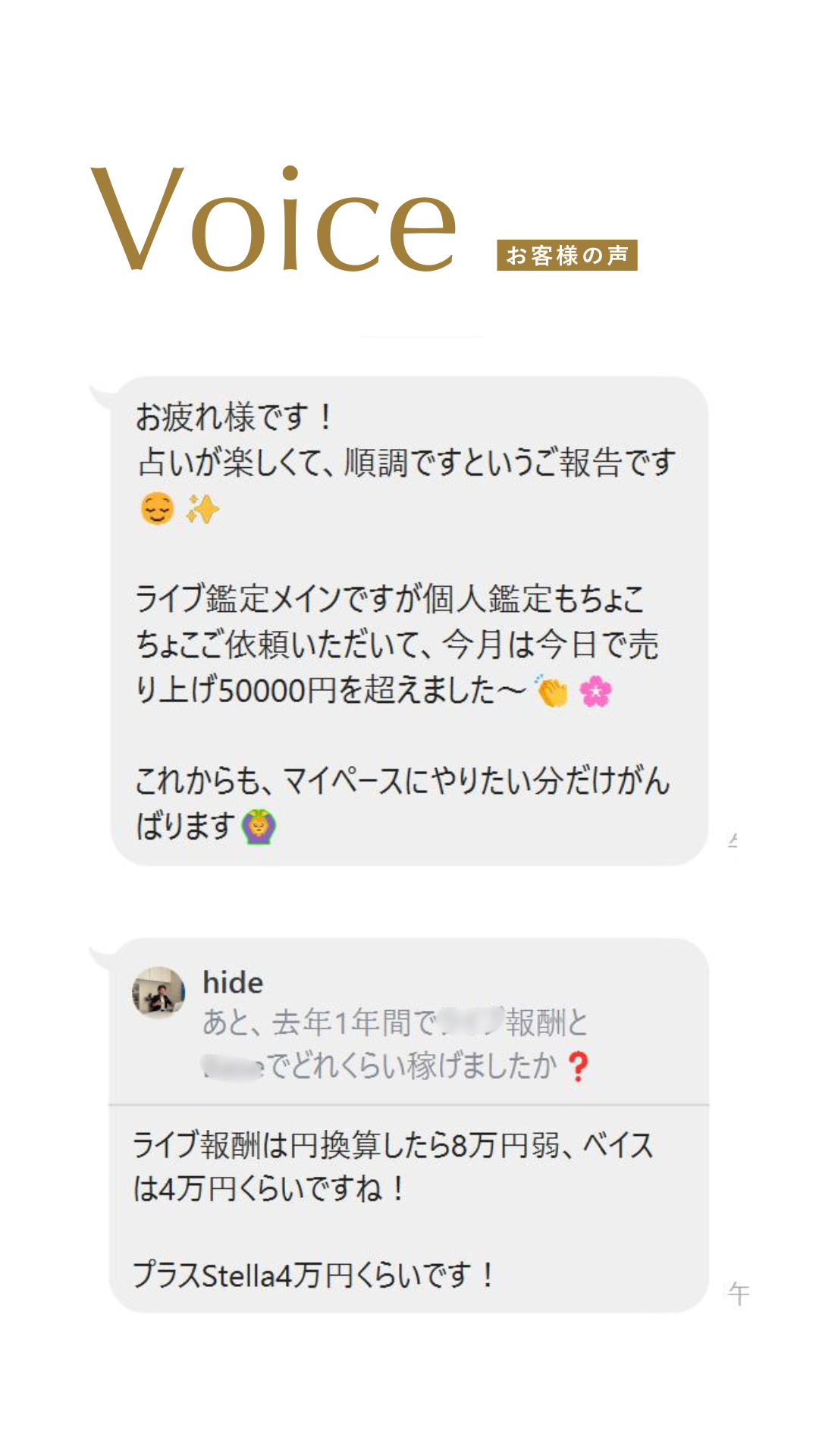 僕の受講生さんがココナラ占い師としてプラチナランクになったり、ゼロから個人事業の占い師にwebプロデュースした知見と経験から、あなたにおいても「現実を変える力」があると自負しています。